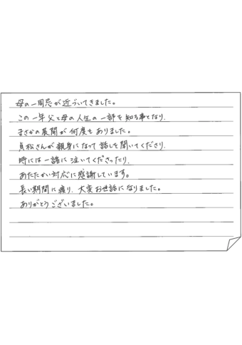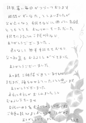 時間がずい分たってしまいましたが父が亡くなり、手続きなどに困っていた時、とてもとてもお心づかいをいただいた手続きに対してのご説明などありがとうございました。