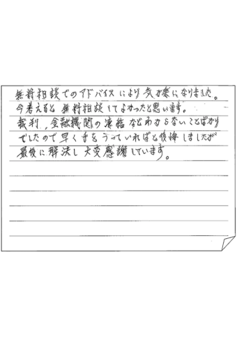 裁判、金融機関の凍結などわからないことばかりでしたので早く手をうっていればと後悔しましたが最後に解決し大変感謝しています。 -