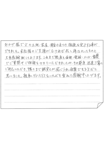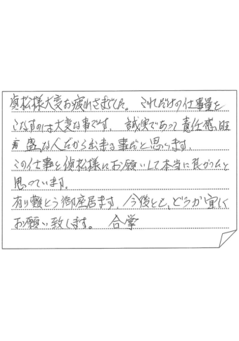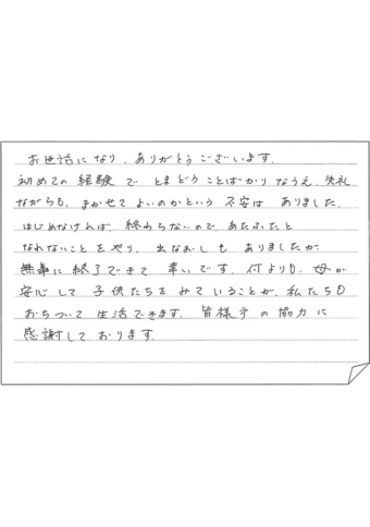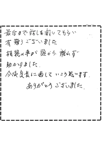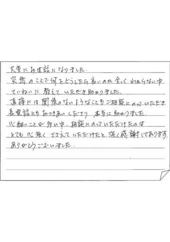 心細いことが多い中、相談にのっていただけたのはとても心強くささえていただけたと、深く感謝しております。 -