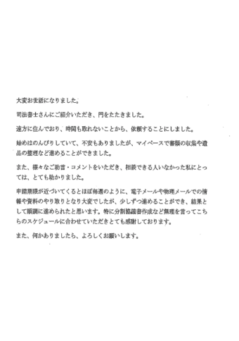 特に分割協議書作成など無理を言ってこちらのスケジュールに合わせていただきとても感謝しております。