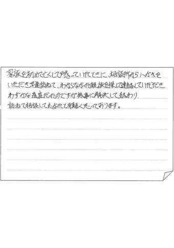 料金も良心的で、問題解決に時間がかかってしまったにもかかわらず、とても親切、丁寧に対応していただき感謝しております。