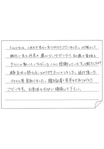 代理として、銀行に足を何度も運んでいただいたり、私達の負担を少なくと動いていただいたことに感謝しています。