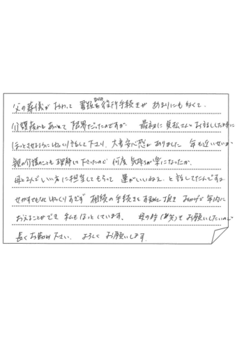 生前、父と相続についてしっかり話したこともなく、具体的に何をどの様にどうすればよいのかわからず、あたふたとした状況でしたが、貞松さんには何度も質問や相談に対応して頂き安心して滞りなく進めることが出来ました。