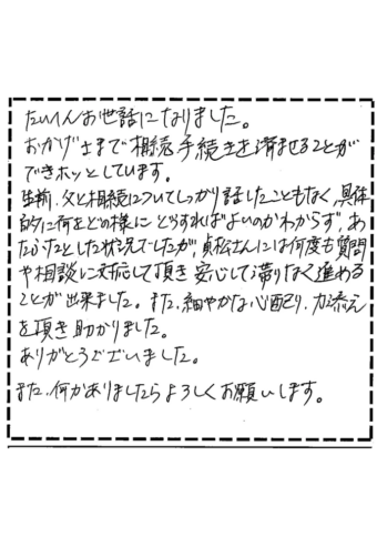 事務的な事は全く分からないのでおまかせするしかありませんでしたが無事に相続の手続きも終わり、ホッとしています。