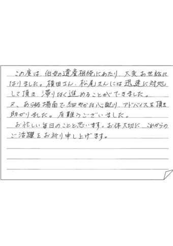 この度は、伯母の遺産相続にあたり、大変お世話になりました。